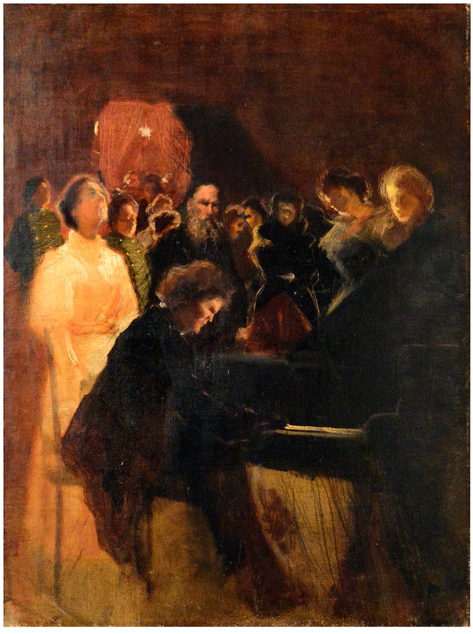 Notre regard aussi est arrêté, fasciné par ce phénomène de la nature. Nous sommes comme Tolstoï sur le tableau de Leonid Pasternak, lorsqu’il assiste à un concert de Rubinstein. Le reste du monde est rouge, brun, de vagues textures avec quelques lumières indéterminées, des figures flottantes… Et dans l’instant, il n’y a que Rubinstein et nous ; il se passe quelque chose d’important et d’irréel. C’est à juste titre qu’un détail du tableau figure sur la couverture de l’album de Leslie Howard, avec les teintes du feu judicieusement appuyées.